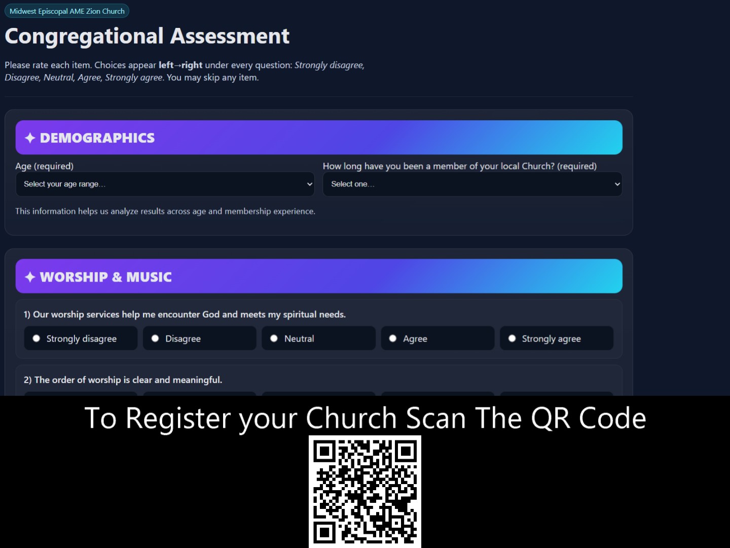 This assessment helps AME Zion congregations see clearly where they are as a Church and where God may be calling them next. It is designed for both members and leaders, with language that is clear and inclusive.